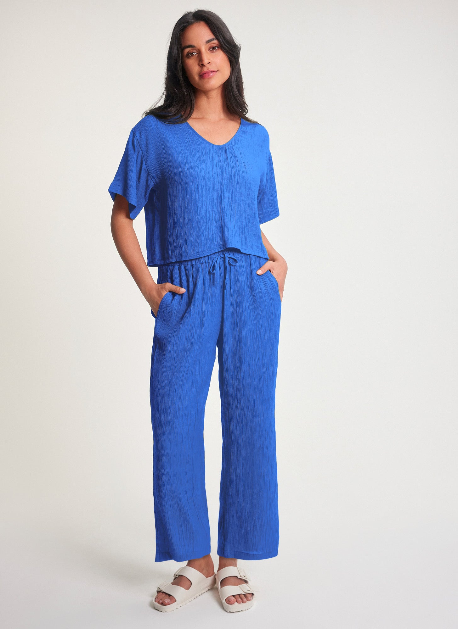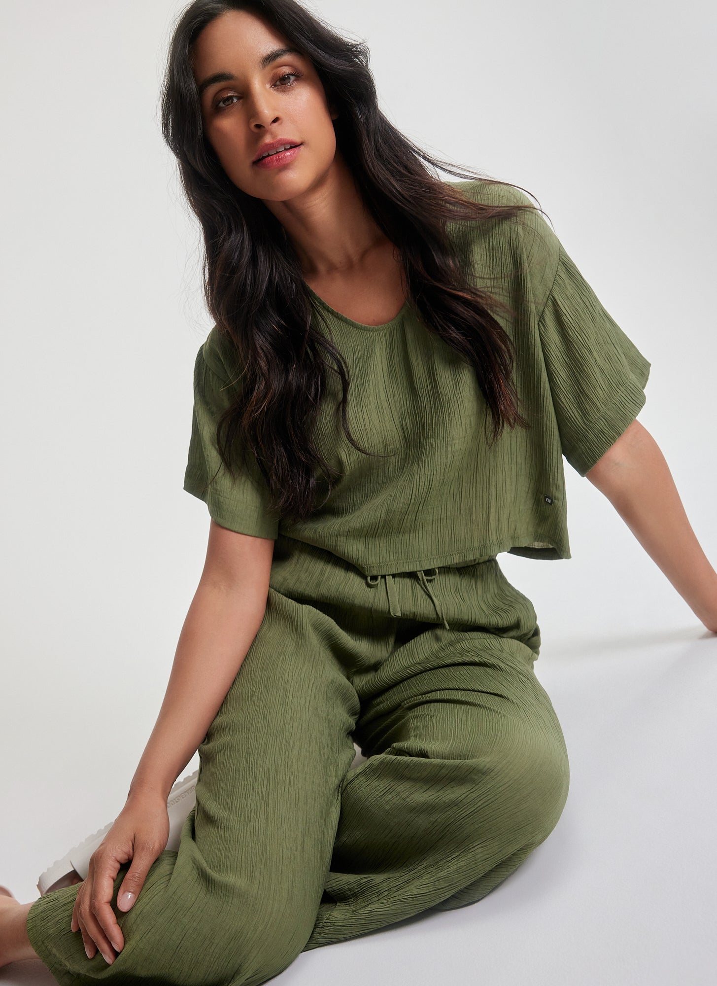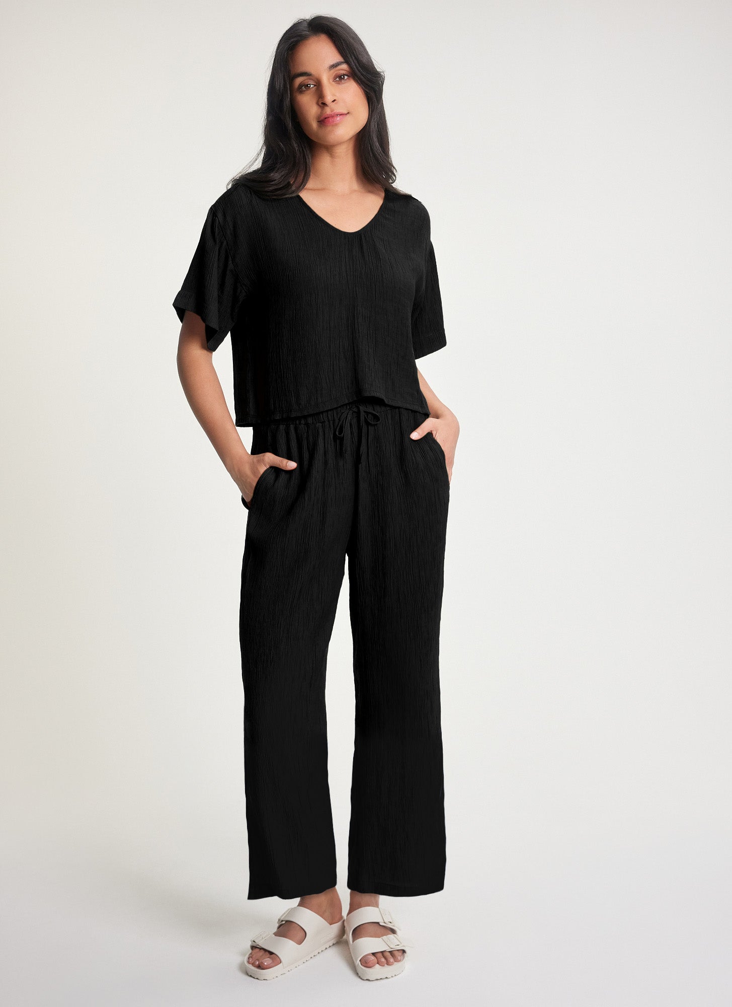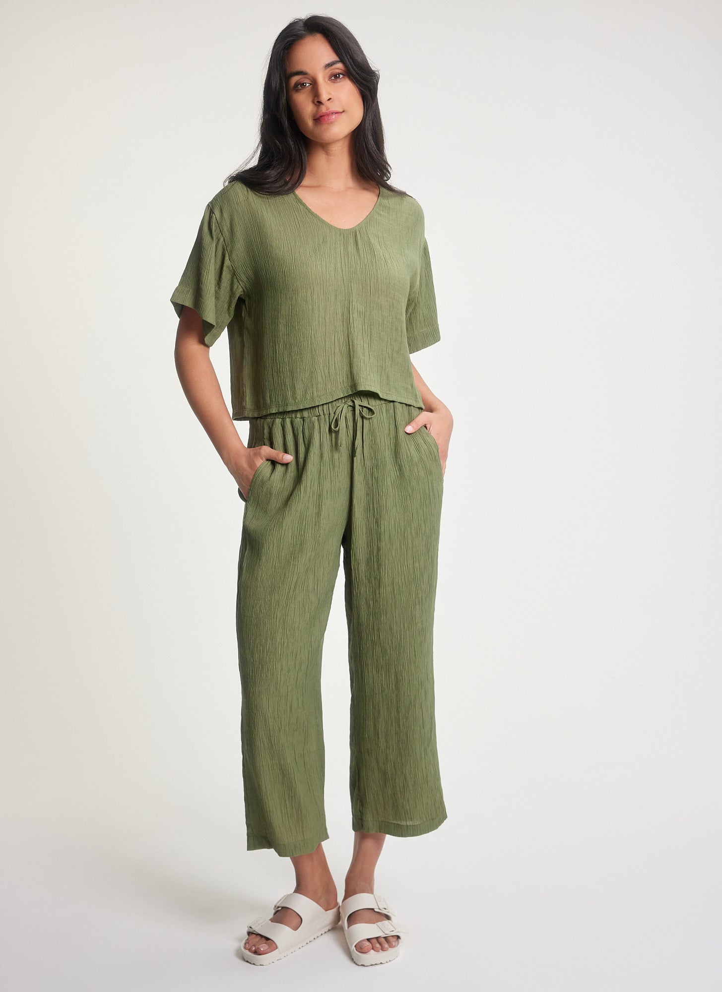 Whether you're packing a carry-on or a backpack, this relaxed drop-shoulder top is made for travel. Lightweight, breathable, and packable, it's crafted from wrinkle-resistant Ecovero™ ripple fabric. Featuring a V-neck collar, crop length, and oversized set-in sleeves, it offers an elegant yet casual go-anywhere style.