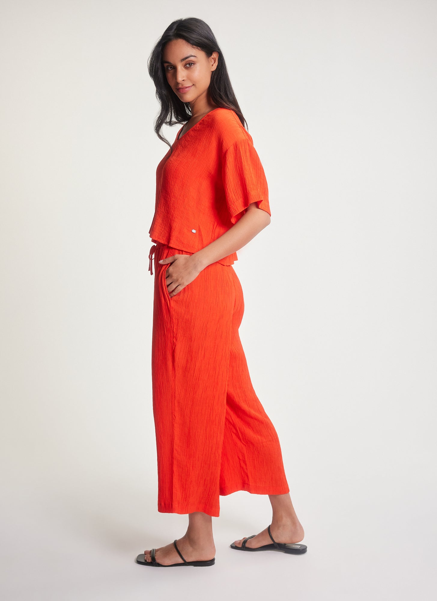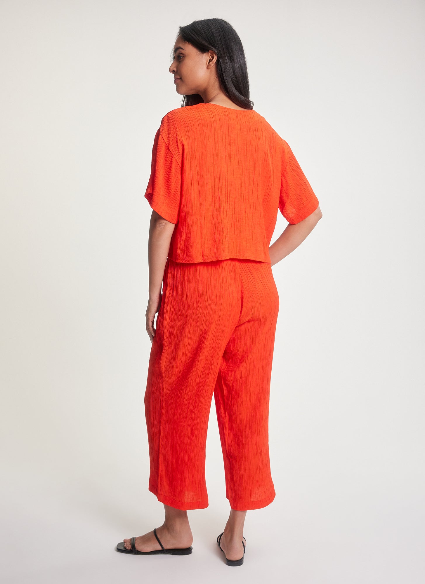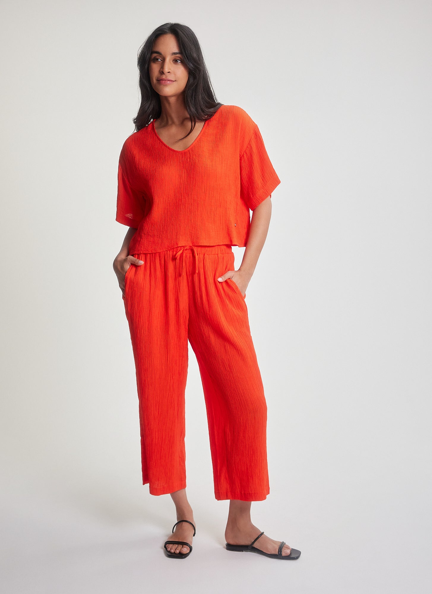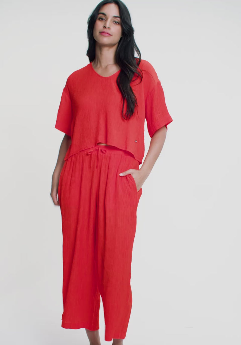 Whether you're packing a carry-on or a backpack, this relaxed drop-shoulder top is made for travel. Lightweight, breathable, and packable, it's crafted from wrinkle-resistant Ecovero™ ripple fabric. Featuring a V-neck collar, crop length, and oversized set-in sleeves, it offers an elegant yet casual go-anywhere style.