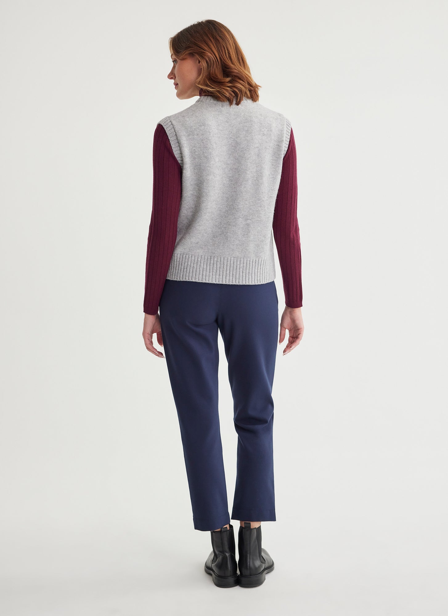 Détails en bord-côte au col, aux emmanchures et à l’ourlet pour une finition impeccable.